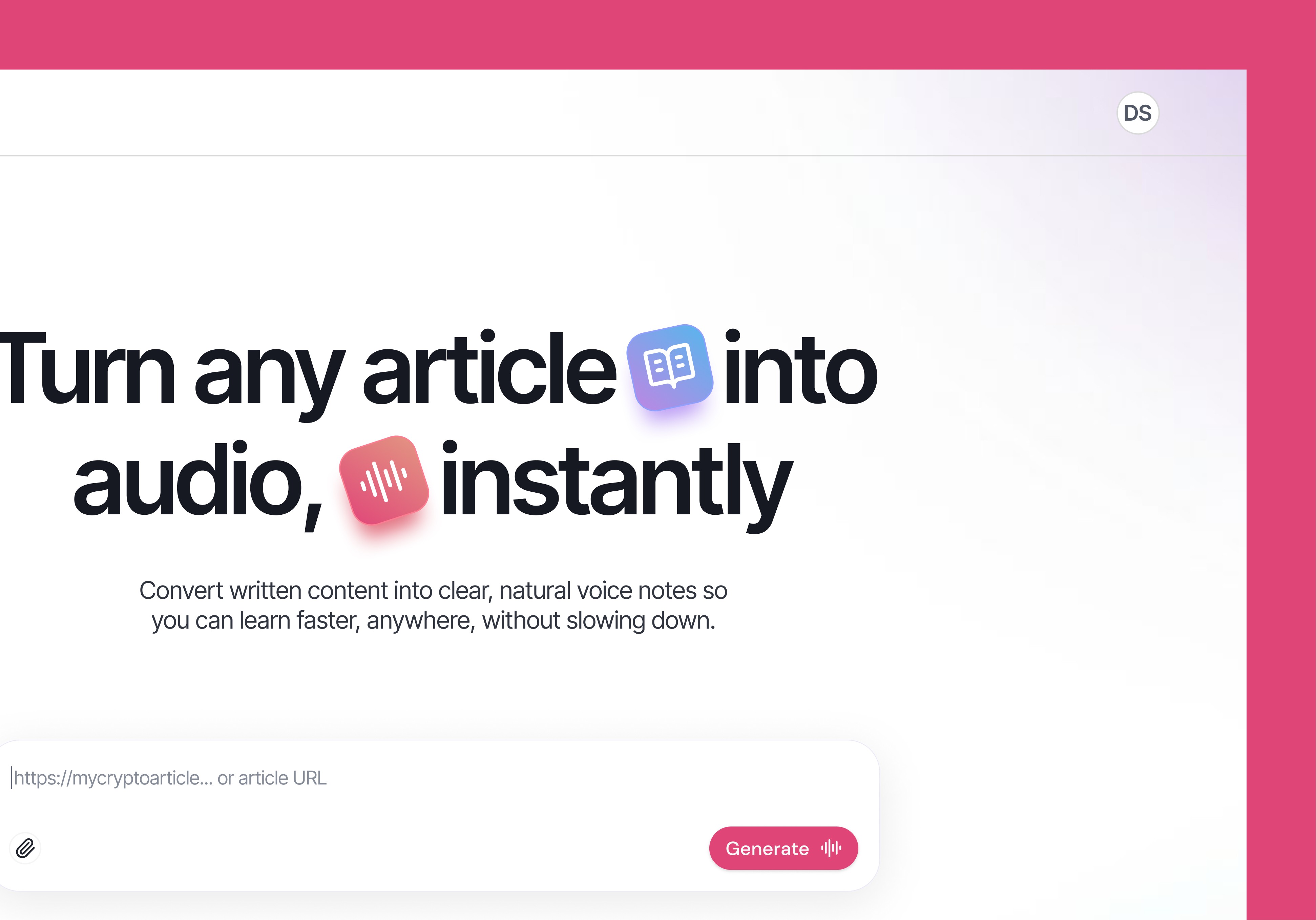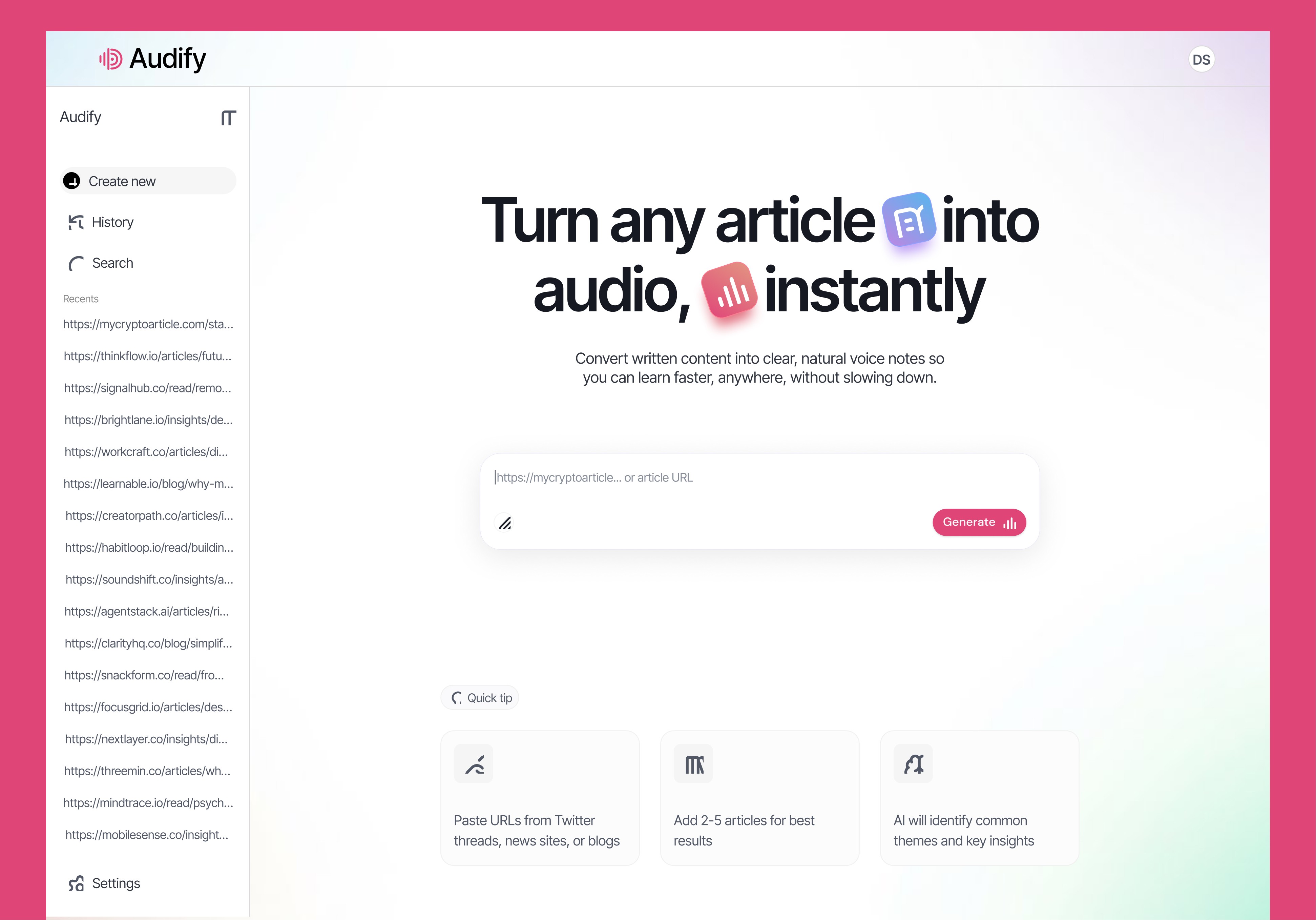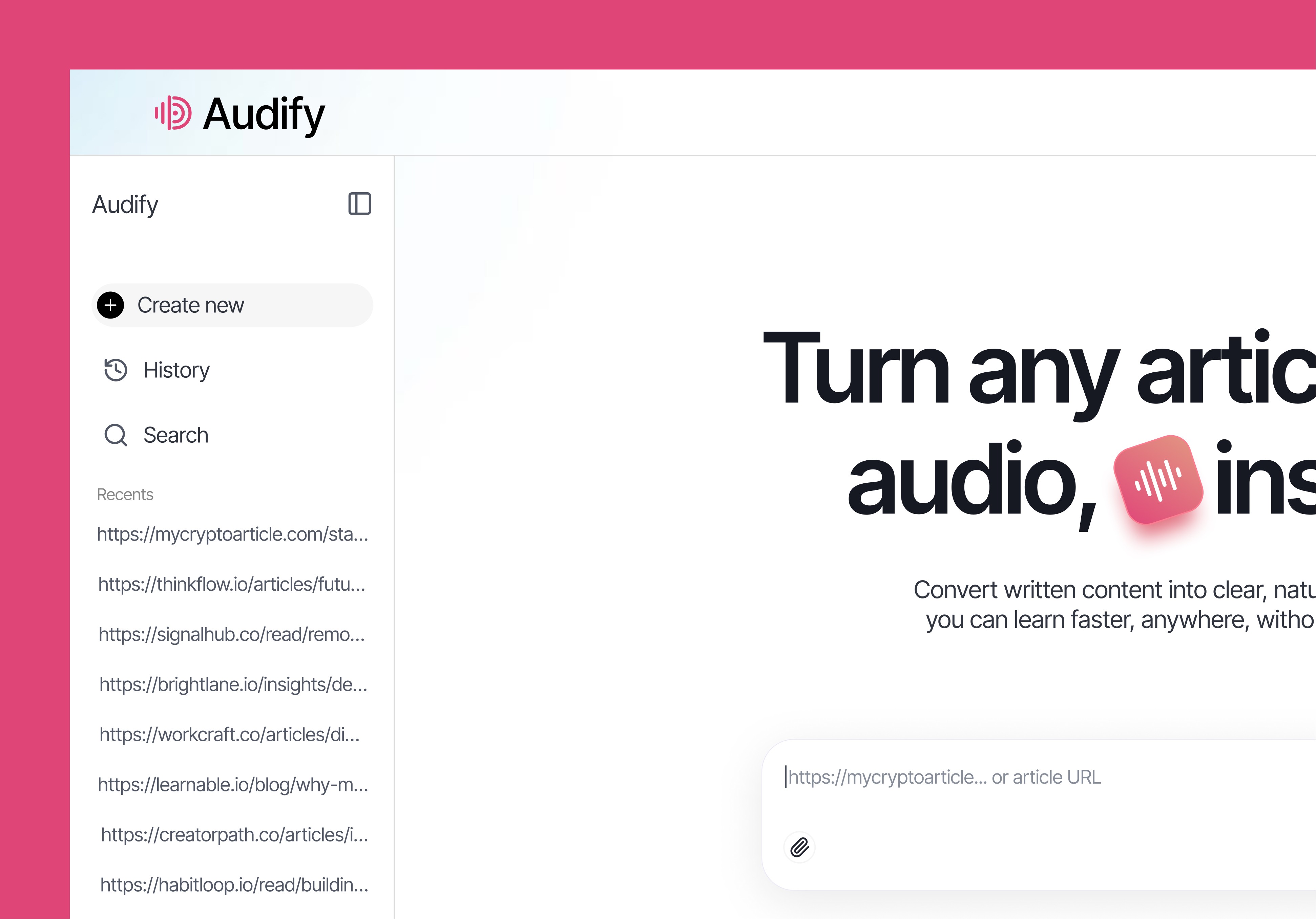Users paste URLs or upload documents, and Audify AI analyzes all sources simultaneously to identify key themes, contradictions, and insights. The system generates a natural voice script prioritizing actionable information, converts it to audio, and delivers a 2-3 minute briefing. Features include user authentication, conversation history, transcript downloads, and an intuitive workflow that makes staying informed effortless.