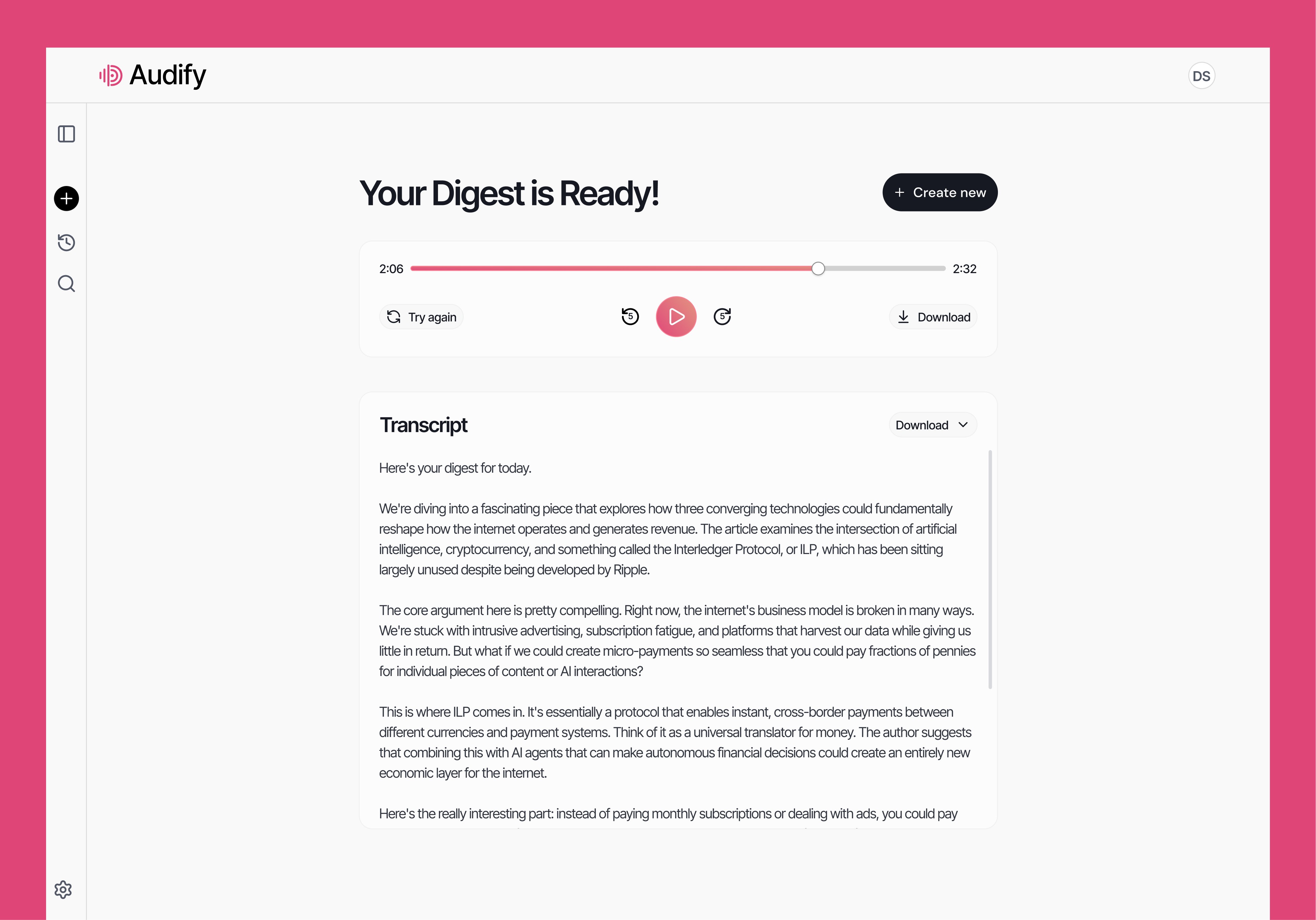Users add content through URLs or file uploads with automatic validation. The AI reads files, fetches articles, and sends everything to Claude with specialized prompting for conversational voice scripts. Claude analyzes sources holistically, identifies trends, and formats insights for audio. The script converts to speech via Web Speech API with playback controls and progress tracking. Logged-in users get automatic history storage, enabling them to revisit digests and download transcripts anytime.